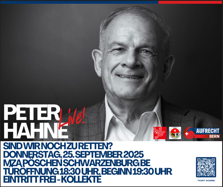 Aufrecht Bern, Freunde der Verfassung Schwarzenburgerland und die Urig Ortsgruppe Schwarzenburg laden Sie herzlich ein zu einem unvergesslichen Abend mit Peter Hahne - dem bekannten Kolumnisten, mehrfachen Buchautoren mit Millionen verkaufter Auflage (z.B. Ist das euer Ernst?! Aufstand gegen Idiotie und Ideologie) und ehemaligen Hauptstadtstudioleiter des ZDF - beste Unterhaltung ist garantiert!